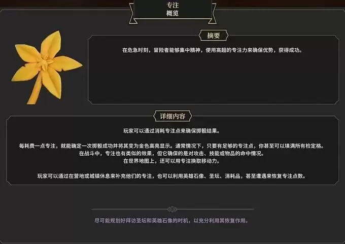 3、专注点的回复方法为在营地或城镇休息,也能够通过英雄石像、圣坛、消耗品和遭遇来恢复专注点。