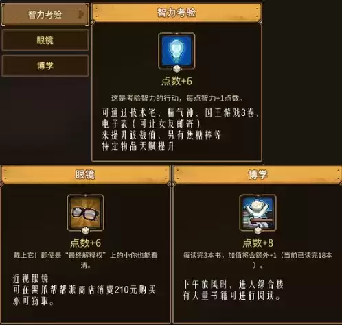 4、在下午阅读书籍时,影响基础点数的也是如上三项,阅读完一本书可以获得智力经验。不过阅读完每本书籍需要累积的“点数”不同,而且系列图书,需要按照123的卷数来进行阅读,请根据当前阅读能力来分配时间吧。