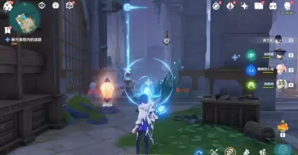 1、首先玩家需要指引来到此处,拾取楼梯的光球能量后,对准机关长按技能,就可以打开铁门。