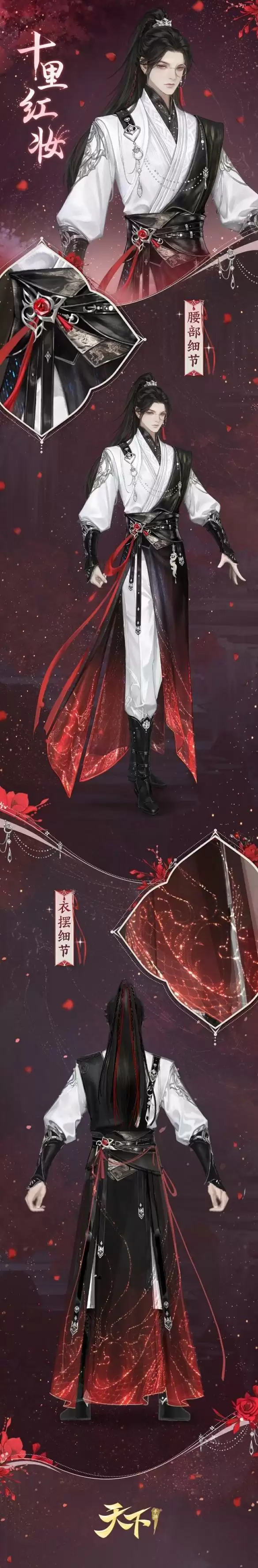 少侠以银冠束起利落马尾,垂落的红绳与长发一起编成麻花小辫,搭配金丝单镜与流苏耳坠,尽显雍容华贵!玄色内衬上有金丝描绘的暗纹,外层的雪白丝绸外袍则点缀了大片银饰,在一黑一白的相互映衬下带来强烈的视觉对比,突出了层次感!肩侧的革扣与胸前银链相连,黑色皮革腰封上的红宝石嵌于雕花银饰之中,鲜红丝带自腰间垂落,更衬出少侠的俊逸潇洒~衣摆由黑红渐变的透纱搭叠而成,其上金线勾勒的纹样还有点点细闪。鲜衣怒马少年郎,大抵就是如此吧!