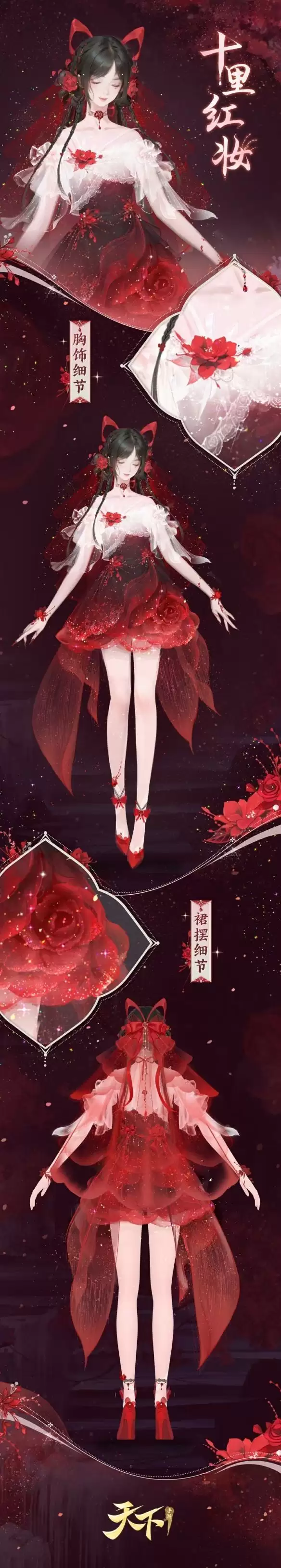 欢娱在今夕,嬿婉及良时。少女一头乌黑秀发梳为几束小辫,脑后殷红头纱飘逸轻盈,鬓边娇艳红花不时随风摇曳,将其衬托得愈加艳丽动人~颈间佩戴的镶金玫瑰吊坠繁复无比,搭配莹白细纱搭叠而成的抹胸,完美展现了少女姣好的肩颈线条!手腕和腰间点缀有馨香花朵,裙摆处别出心裁地设计成一朵绽放的玫瑰花,行走时细碎星光便随裙摆飘散而下,仿佛周遭的空气都染上了别样的光彩!当少女款款走来时,又有几人能不对她心动?