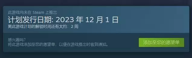 1、游戏的计划发行日期为2023年的12月1日,如果大家关注这款游戏,可以加入愿望单以第一时间收到提醒。