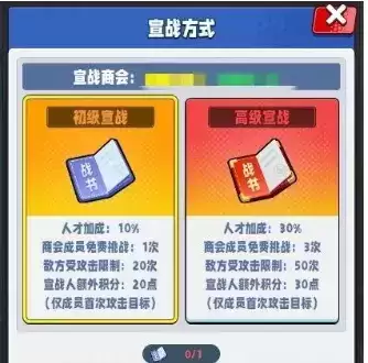 宣战时商会成员可获得一定的免费进攻次数,人才能力获得一定比例的加成,被宣战商会成员有一定攻击次数上限。普通宣战和高级宣战所增加的次数、比例有所不同。