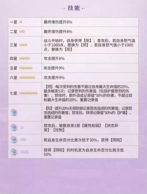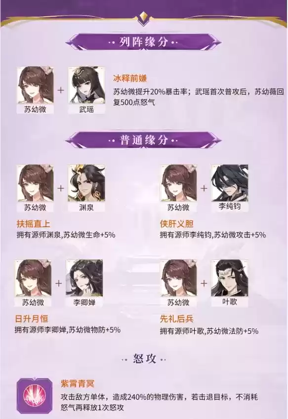 上述信息就是有关于元尊苏幼微怎么样的详细资讯了,这个角色可以提升20%无视防御记录怒攻造成的伤害值,记录怒攻造成的伤害值,怒攻后,获得记录值50%的护盾,重置记录值,可以说是非常的强力了。