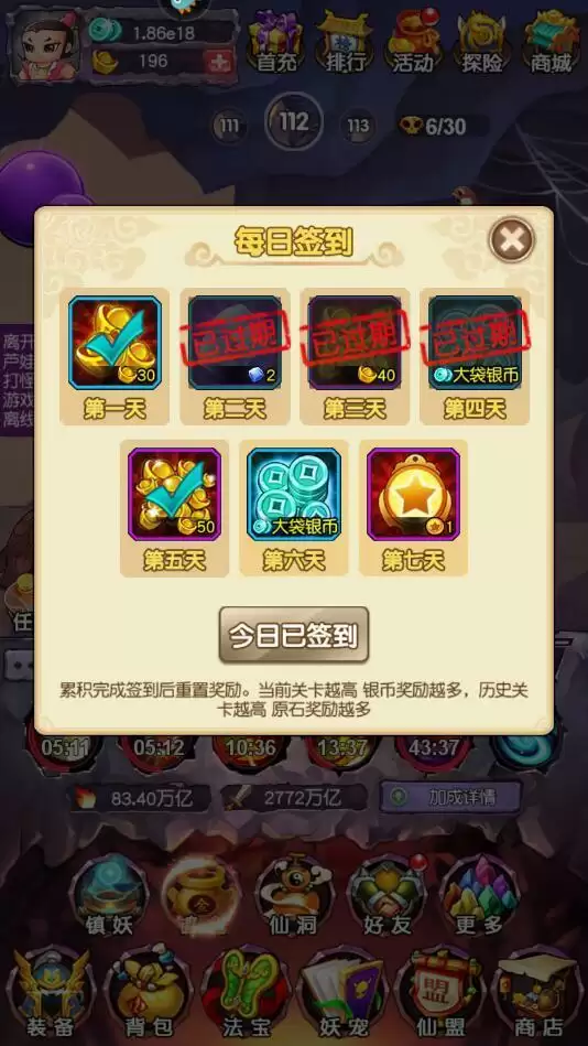 5、点击探险界面中的每日签到菜单,连续签到也有机获得元宝