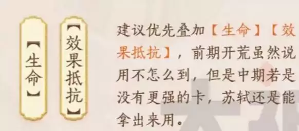 苏轼作为前期送的地卡,在没有其他名士的时候可以拿来作为刷图工具,群体伤害不低,并且配合上佛印能降低敌方攻击,能输出能治疗,比较全能。比较适合前期开荒,效率较高。