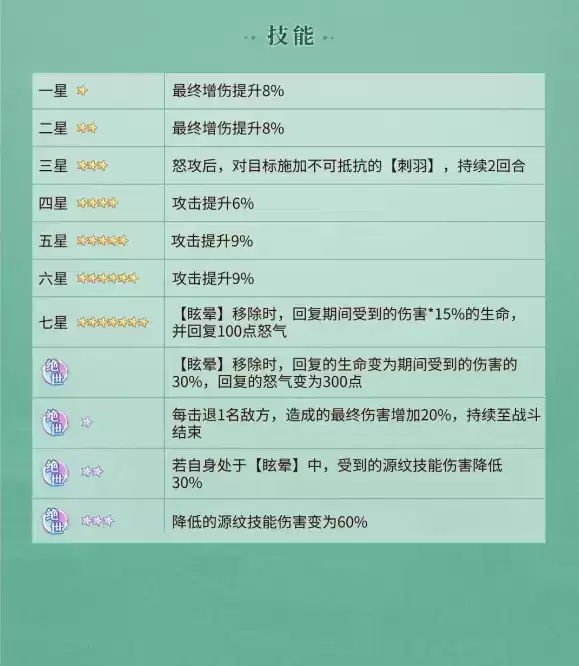 上述信息就是有关于元尊秦莲怎么样的详细资讯了,在眩晕移除时,回复的生命变为期间受到的伤害的30%,回复的怒气变为300点,同时每击退1名敌方,造成的最终伤害增加20%,持续至战斗结束。