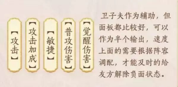 卫子夫适用于PVP场景中,建议搭配群体输出和单体输出还有控制使用,不管卫子夫的特性技能[驱散]还是觉醒技能[破甲]都可以给输出营造一个良好的输出环境。
