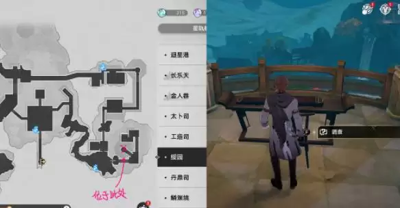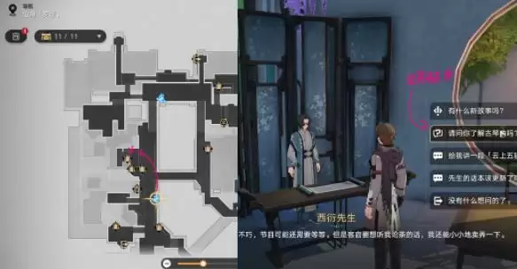 1、接取位置如图所示,在古琴处选择“调查”。。