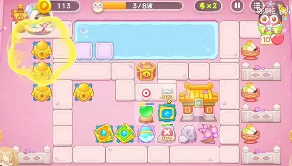 1、首先可以在左边的位置放上一个金元宝,这个是群体攻击的炮台。