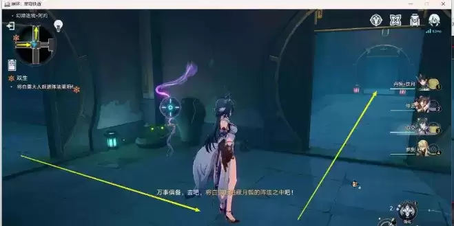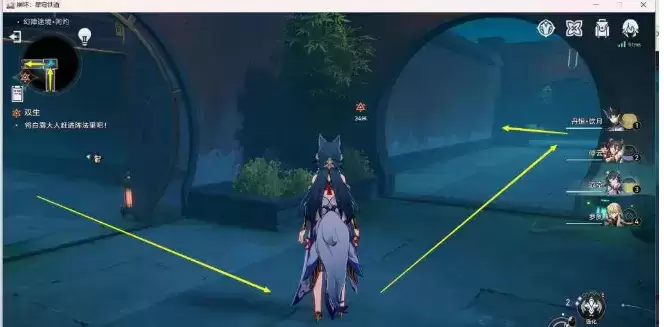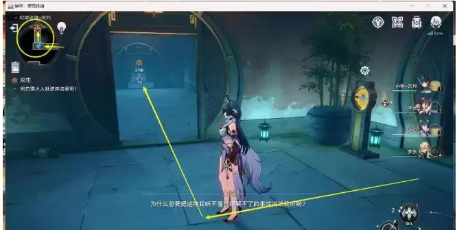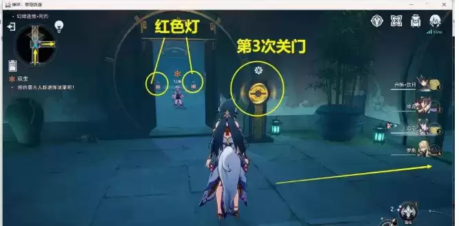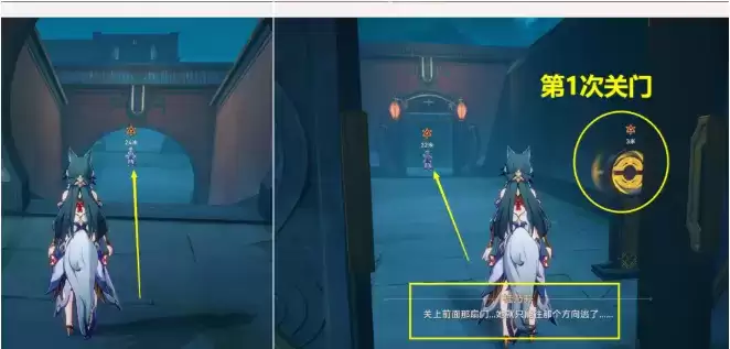 4、进副本后,下去一直先追着逃跑的【白露】走,一直追到下图位置时,【桂乃芬】会提示我们【关门】,这时我们将下图位置的门关了,这里是关第1个门,后面还需要关2个门,【关门】的目的是堵住逃跑的【白露】,最终将其赶到阵法里,捉住附在【白露】身上的岁阳【阿灼】,后面找不到具体位置的,可以看左上小地图我的位置