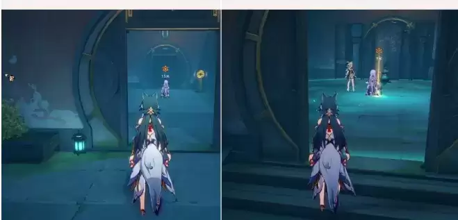 8、然后走到上图位置【白露】站的位置后,【白露】又会进到前面有【2个红色灯的房间里】,这时我们将外面的门关了,这里是关第3个门,关门后,我们走右边,到右边路尽头位置后,再一直靠左走,目的是绕一圈到【白露】身后去
