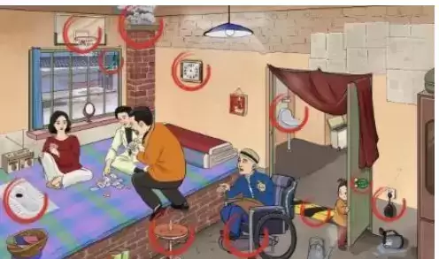 2、接着我们就可以在画面上继续找到屋顶滑梯、室内篮球、室内烟囱、无指针表、脚蹬轮椅、两用水池等离谱的答案。