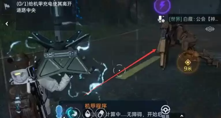 6、然后拿着避雷针放到机甲和放置物的中间,给机甲充电,即可完成任务。