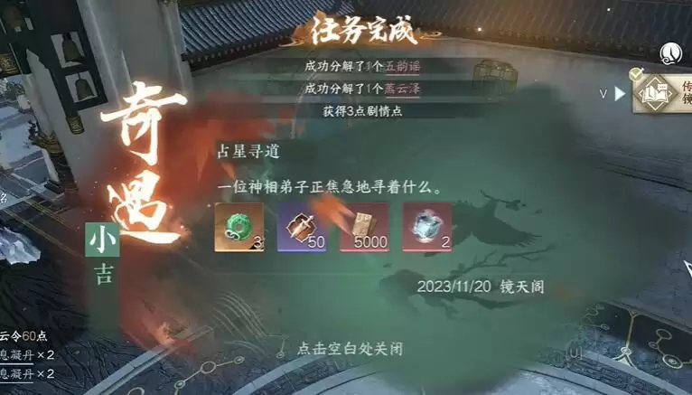4、任务奖励为3剧情点,3绑玉+50风云令+5000交子+心法狗粮。