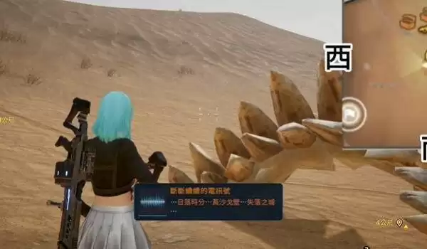 2、接着触发剧情和黑色的石碑对话获得信息关键词:日落时分、黄沙戈壁和失落之城。