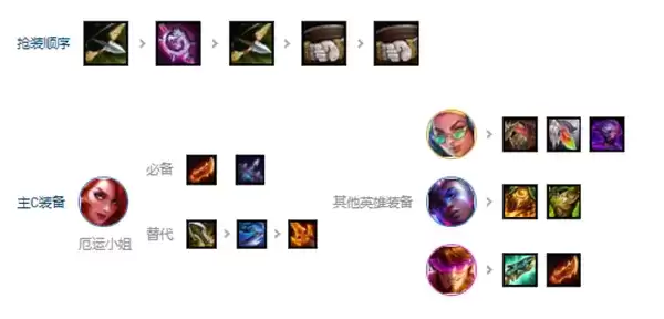 1、优先给厄运小姐鬼刀和轻语,剩下一件带其他的物理输出装都可以,肉装可以给俄洛伊和艾克,多余的法强装备给卡牌大师。