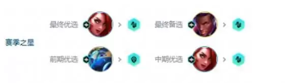 3。赛季之星前期可以选择凯南来给前期打工,等到7级之后可以开始找厄运小姐的赛季之星,如果一直没有可以找5费卡的赛季之星。