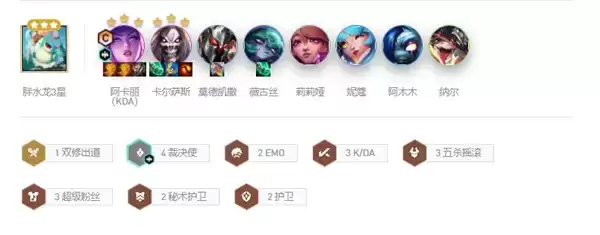 2、组成羁绊:4裁决使、2EMO、3KDA、3五杀摇滚、3超级粉丝、2秘书护卫、2护卫、1双修出道。