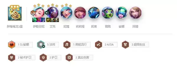 2、组成羁绊:5法师、3kda、3超级粉丝、2秘书护卫、2护卫、2真实伤害、1DJ娑娜、1高能流行。