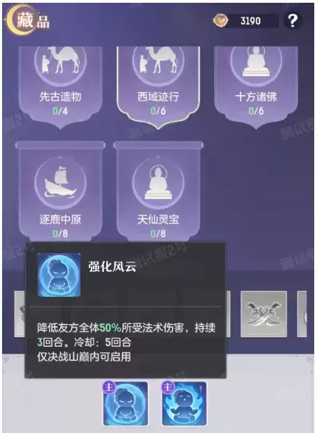 若是带有羁绊的神器聚首,更会给你带来新特技效果,除了被动可以全程触发外,主动特技只能生效一个!大家可以根据自身和队伍的打法进行抉择;比如由【逐鹿中原】八大藏品带来的加强版舍身,能无消耗复活全部队友。由【西域迹行】六大藏品带来的加强版风云之护,能降低更多受到的伤害等等。