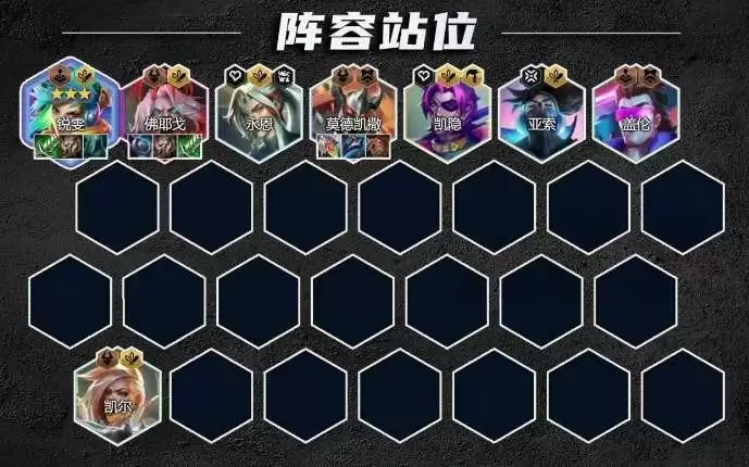 棋子组成:凯尔+永恩+铁男+亚索+盖伦+永恩+瑞文+佛耶戈+凯隐。