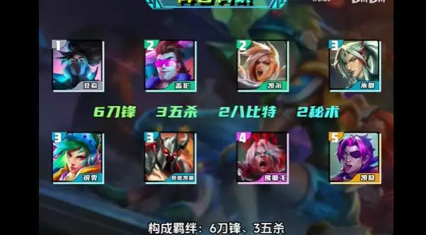 羁绊效果:7刀锋领主+3五杀摇滚+2八比特+2秘术护卫+1影流之镰。