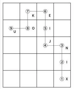 先将路线图按直角画下来,然后画出一个5X4(五行四列)的表格,将英文密码横向添入表格,然后根据路线找岀所需字母,并拼出 xinjiekou=新街口