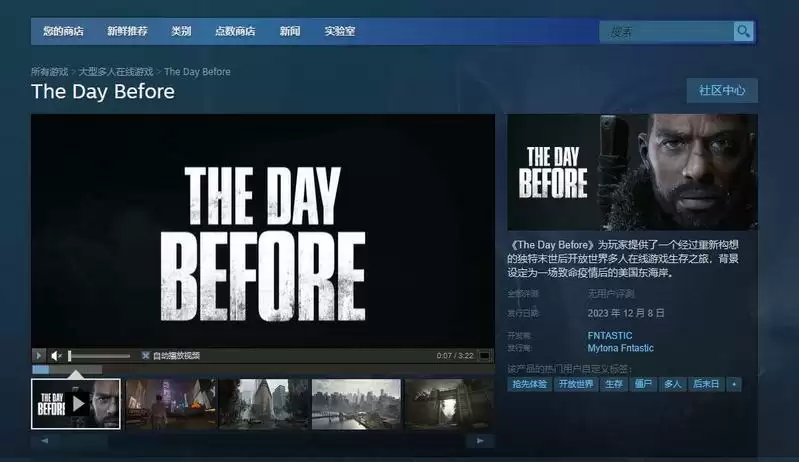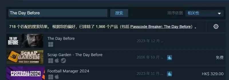 1、我们在steam上搜索浩劫前夕是搜索不到游戏的,必须搜索英文名“The Day Before”才会出现游戏。