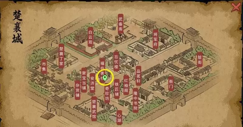 1、首先玩家需要来到这个楚襄城中的这个客栈的外面。