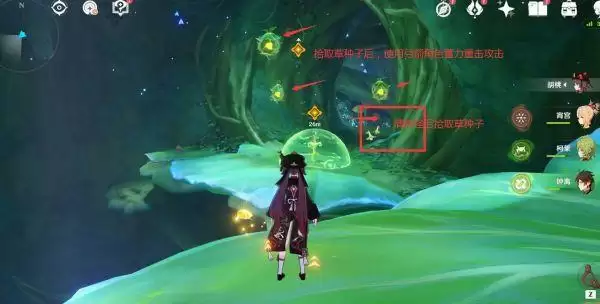 清除前方右手边的怪获取草种子,使用弓箭角色蓄力重击攻击标记的草球。
