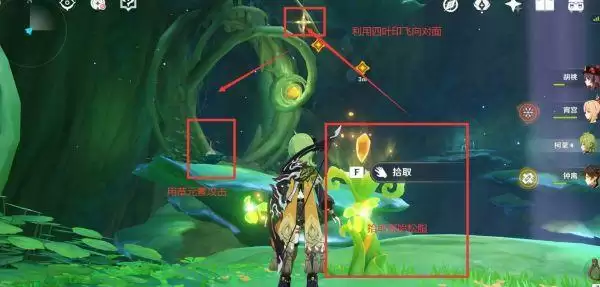 解锁3个草球后拾取原始松脂,用草元素攻击左手方向的众叶觉蕊,并利用四叶印飞向对面可以找到两个宝箱,收集之后再原路返回黯道处弹琴。