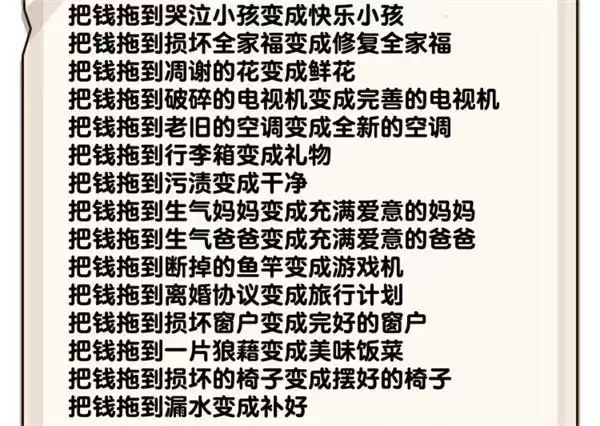 7、把钱拖到生气妈妈变成充满爱意的妈妈。把钱拖到生气爸爸变成充满爱意的爸爸。