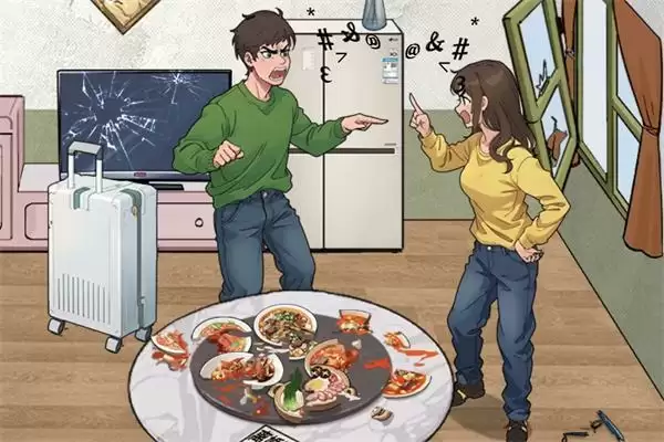 爆梗找茬王中家庭矛盾这一关需要玩家将画面中的夫妻化解吵架的矛盾,玩家需要注意上方的时间倒计时,在规定的时间内用画面左下角的钱修不好所有可以发生矛盾的地方。