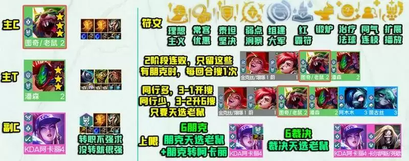 注意:这个阵容前期拿朋克,3阶段追图奇、潘森,追出来后上7上8,根据自己天选和转职补上限,6裁决或者6朋克。