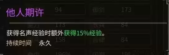 大侠立志传游戏中有很多天赋词条可以获得,他人期许是一个紫色的天赋,这个天赋可以让玩家获得名声经验时额外获得15%经验,玩家可以去获取这个天赋。