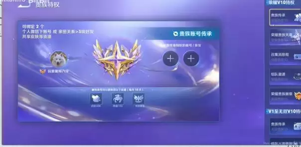 1、V10贵族新增的【传承】特效,可以绑定一个好友,被绑定的好友可以获得改V10贵族账户上的英雄、皮肤、星传说使用权,且解锁一个特殊的贵族徽章。