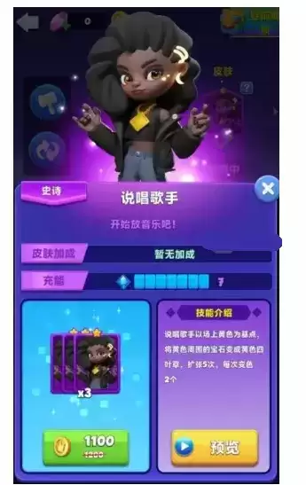 ①角色:紫卡里,推荐说唱黑妹。技能也是变宝石颜色。思路和斗牛士是一个思路,不过,黑妹的效果优点是范围大,缺点是不能整理棋盘。