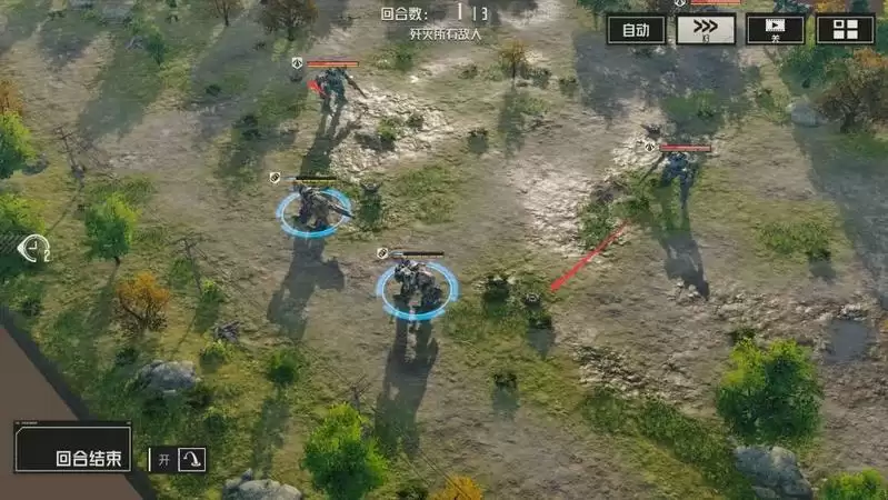 2、第二回合:先将绳索兵移动至箭头位置,然后将敌方拉过来。击退兵移动至箭头位置,然后回头,使用击退技能,将敌方打至地雷上。