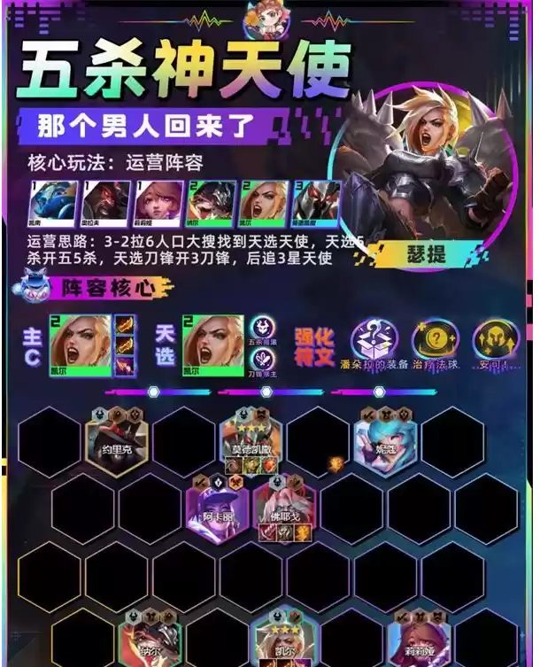 金铲铲之战五杀神天使是很不错的阵容,这个阵容输出还是不错的。不清楚这个阵容是怎么搭配的小伙伴们,这个阵容搭配技巧还是很简单的,就让小编给大家详细的讲讲,一起来看看搭配吧。