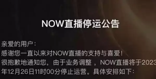 1、由于业务调整,NOW直播将于2023年12月26日停止运营,可以看到停运的原因就是这个技术调整。