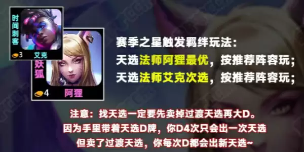 3、4-2拉8,卖掉过渡天选,大D找阿狸或艾克法师天选以及基础体系牌随后慢D3、4费2星,娑娜选第三形态输出,约里克可用锤石代替。