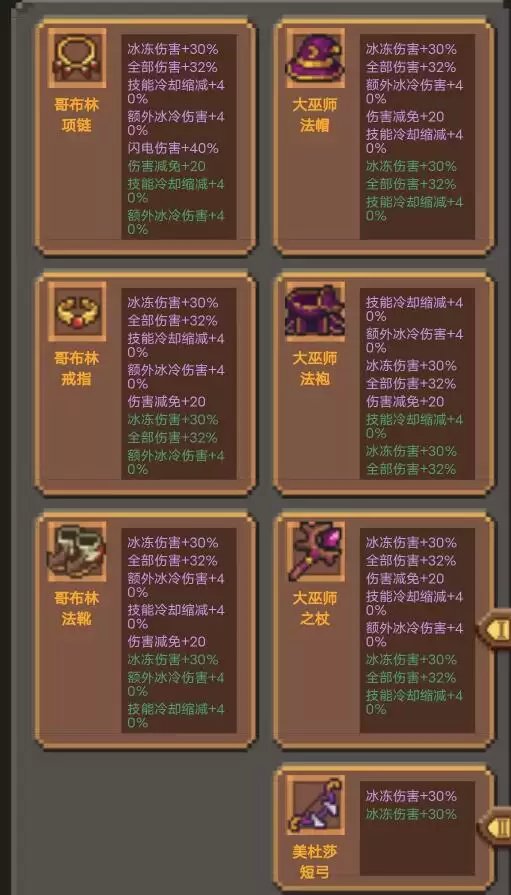 推荐大巫师三件套和哥布林三件套,武器推荐美杜莎短弓,大巫师三件套集齐之后,能触发隐藏法袍效果。