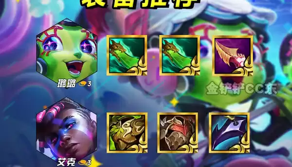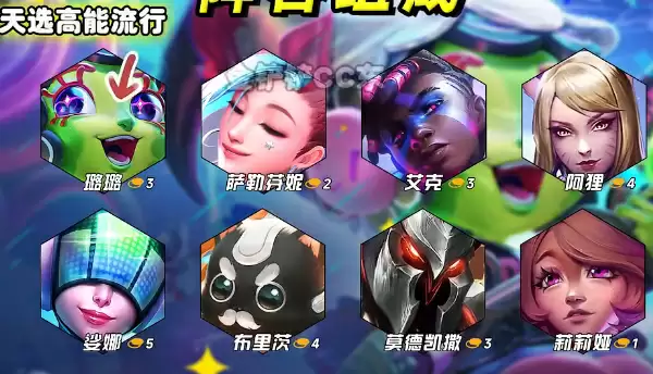 1、阵容组成:莉莉娅、凯南、酒桶/萨勒芬妮、艾克、璐璐、妮蔻、娑娜、阿狸。
