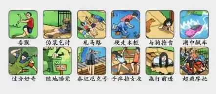 【耍猴、过分好奇、伪装乞讨、轧马路、硬走木桩、与狗抢食、随地睡觉、泰坦尼克号、手痒推女友、拖行前进、湖中飙车、超载摩托】