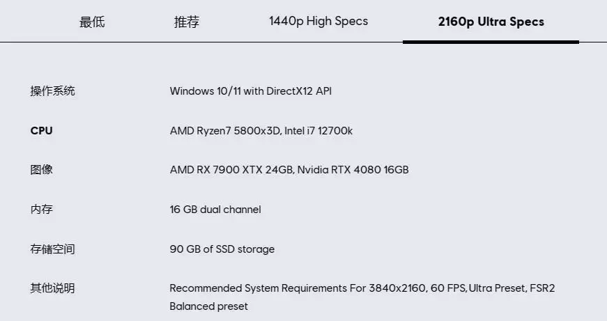 Recommended System Requirements For 3840x2160, 60 FPS, Ultra Preset, FSR2 Balanced preset