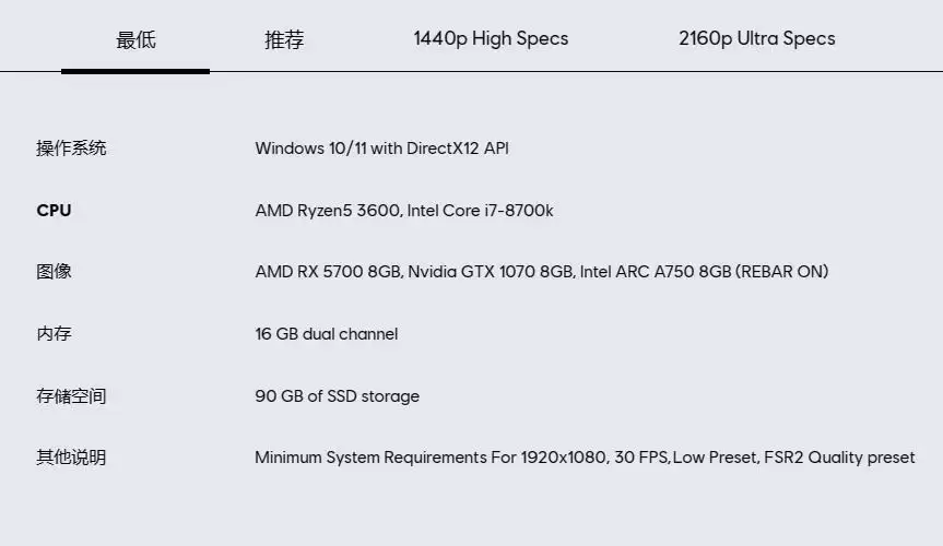 Minimum System Requirements For 1920x1080, 30 FPS, Low Preset, FSR2 Quality preset