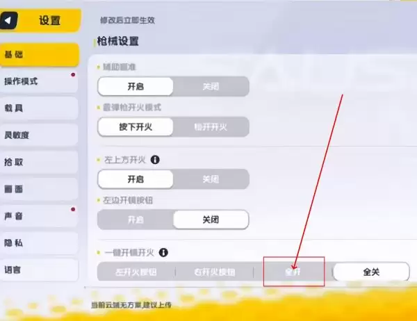 2、在基础设置中找到一键开镜开火设置,点击【全开】。