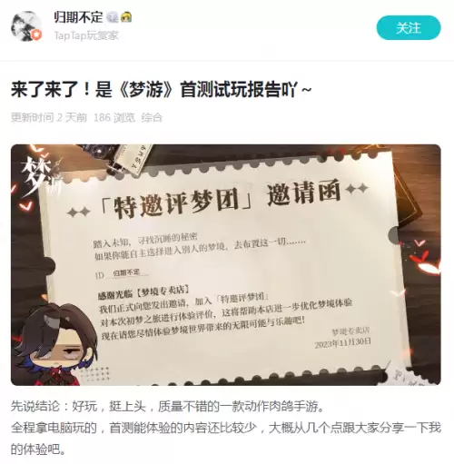 首测中《梦游》展示出了较高的完成度,在品质上、玩法上以及创新点上均得到了诸多玩家的认可与称赞。受邀参与首测的taptap玩赏家【归期不定】表示这是一款好玩、上头,且质量不错的动作肉鸽手游。同时该名玩家还给出了“《梦游》从概念到画面到剧情到玩法,都表现出比较高的品质,也都有吸引我的点。虽然只是第一次面向玩家开启测试,但是可以看出游戏的制作水平和标准都比较高,可以称得上未来可期。”这样的高评价。