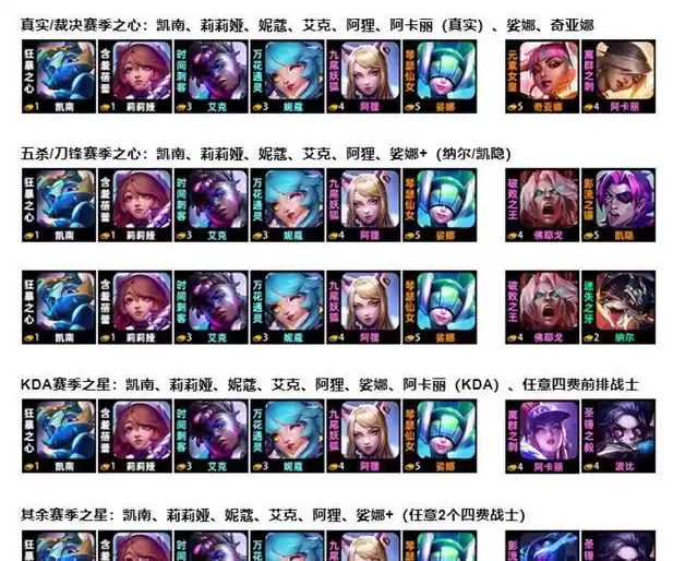 (4)其余赛季之星:凯南、莉莉娅、妮蔻、艾克、阿狸、娑娜+(任意2个四费战士)